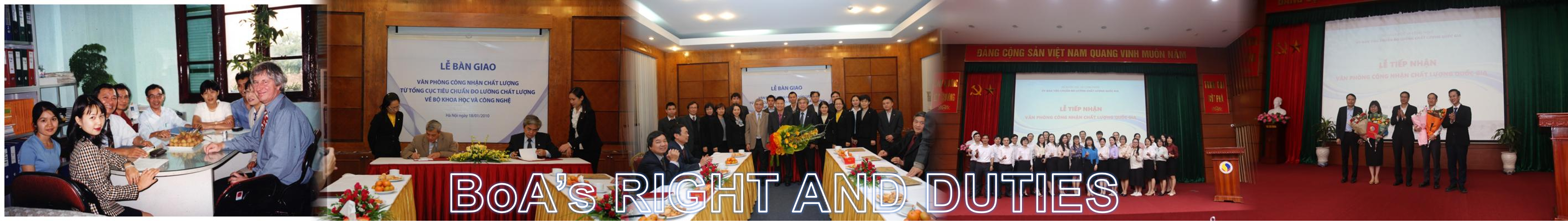 The National Accreditation Bureau (BoA) is a national accreditation body with legal status, its own seal and is allowed to open an account at the State Treasury and a bank to operate and conduct transactions in accordance with the law. BoA has the following main tasks:
