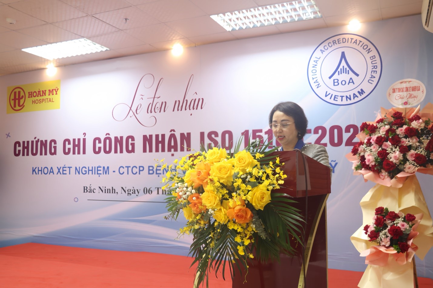 Phát biểu tại buổi lễ, ông Nguyễn Văn Bình – Phó Giám đốc Sở Y tế Bắc Ninh ghi nhận và đánh giá cao nỗ lực của Bệnh viện Quốc tế Hoàn Mỹ trong việc xây dựng, triển khai và duy trì hệ thống quản lý chất lượng phòng xét nghiệm theo tiêu chuẩn ISO 15189:2022. Ông nhấn mạnh, việc được công nhận theo tiêu chuẩn quốc tế không chỉ góp phần nâng cao chất lượng chuyên môn xét nghiệm, mà còn thể hiện cam kết mạnh mẽ của bệnh viện đối với an toàn người bệnh, độ tin cậy của kết quả xét nghiệm và sự minh bạch trong hoạt động chuyên môn, phù hợp với định hướng nâng cao chất lượng dịch vụ y tế của ngành Y tế tỉnh Bắc Ninh.