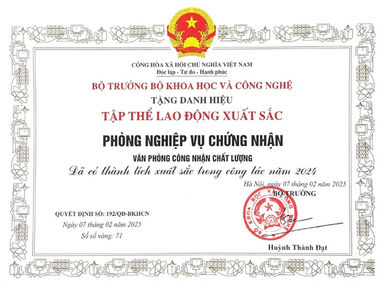 Ghi nhận những nỗ lực đó, Bộ trưởng Bộ Khoa học và Công nghệ đã tặng Bằng khen Tập thể Lao động xuất sắc cho Phòng VICAS trong các năm 2020, 2021 và 2024.